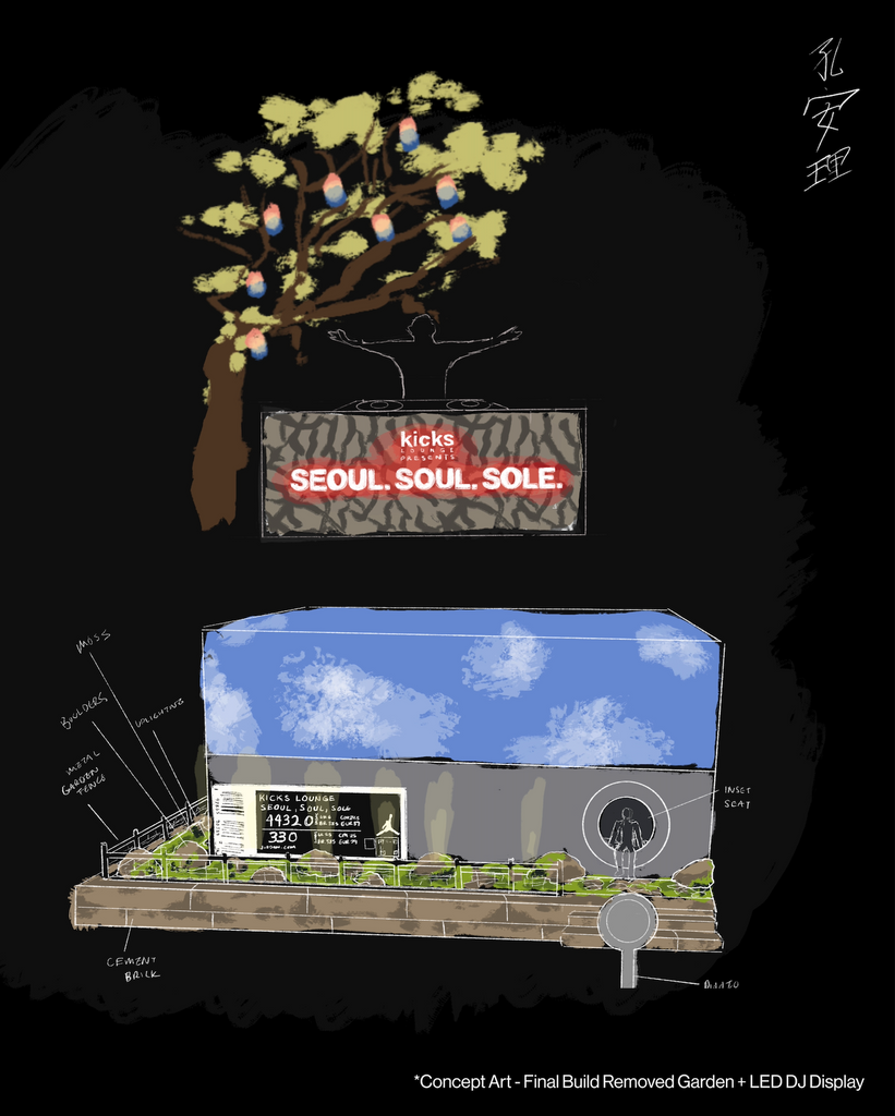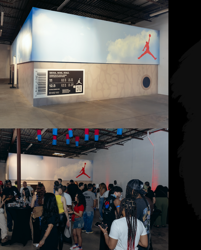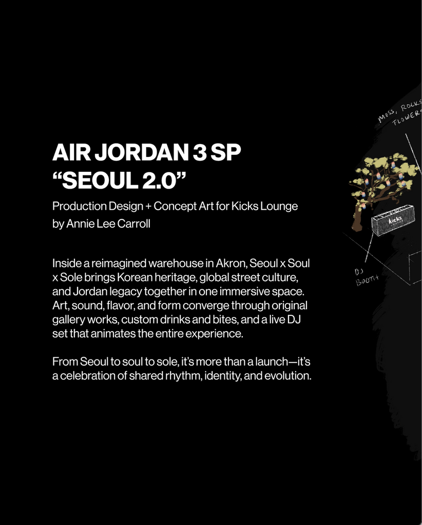 I served as Production Designer for Seoul, Soul, Sole at Kicks Lounge Akron, transforming a large, stark warehouse into a vibrant, immersive celebration of the Air Jordan 3 “Seoul 2.0.” Originally released in 2018 to honor the 1988 Seoul Olympics, the updated shoe draws from Korean culture, incorporating refined materials, aged detailing, and symbols of gguem (dream) and jeong (deep connection).
